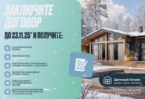Планируйте строительство заранее и пользуйтесь уникальными бонусами: оформите договор до 23 ноября 2025 года и начинайте строительство с 1 декабря 2025 по 31 января 2026 года с полной поддержкой от нашей компании.
