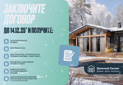 Планируйте строительство заранее и экономьте: заморозьте цены на ваш будущий дом уже в декабре 2025 года и приступайте к строительству в марте 2026 года. Мы позаботились о том, чтобы старт стройки был комфортным, а процесс — максимально выгодным.