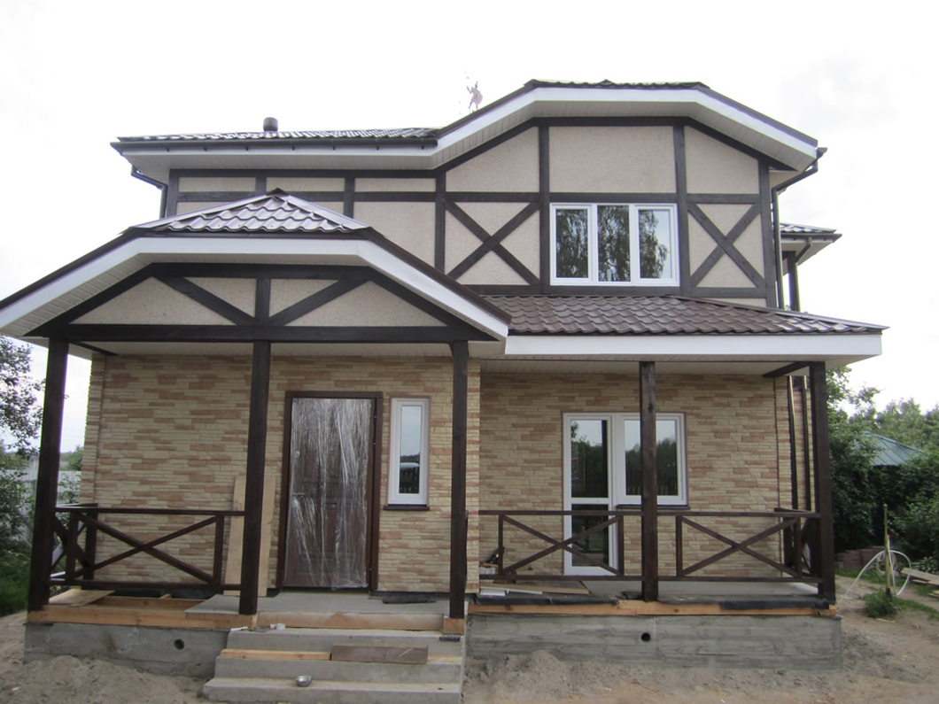 Дом в деревне Авдотьино, Щелковского района был построен по каркасной канадской технологии с утеплением наружного контура в 200мм. В качестве наружной отдекли первого этажа использовались пластиковые фасадные панели Nailite. Второй этаж дома отделан плитами из цементно-стружечной плиты, расшитой декоративной доской в баварском стиле фахверк. Проект дома запроектирован в два полных этажа с максимально рациональной планировкой для данного участка.