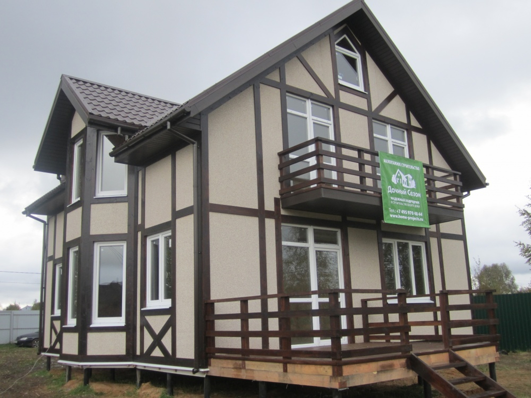 К постройке дома в д.Безово, Заказчики подошли с особым вкусом! За основу проекта был выбран один из построенных нами домов в стиле фахверк. Дом общей площадью 145 кв.м. был построен в рекордные сроки: 40 дней. Каркасная канадская технология позволяет строить шедевры, выбирая любую отделку! В качестве наружной отделки использовался материал, заменяющий штукатурку – это ЦСП с мраморно-гранитной крошкой. Фундамент, был запроектирован на винтовых металлических сваях, т.к. почва на участке Заказчиков – глина, а высота грунтовых вод выше глубины промерзания.