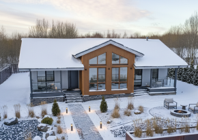 Внутренняя отделка выполнена из натуральной древесины, что придает помещению тепло и уют, а высокие потолки и крупные окна создают ощущение простора и наполненности светом. Дом отлично подойдет для круглогодичного проживания или загородного отдыха всей семьей.