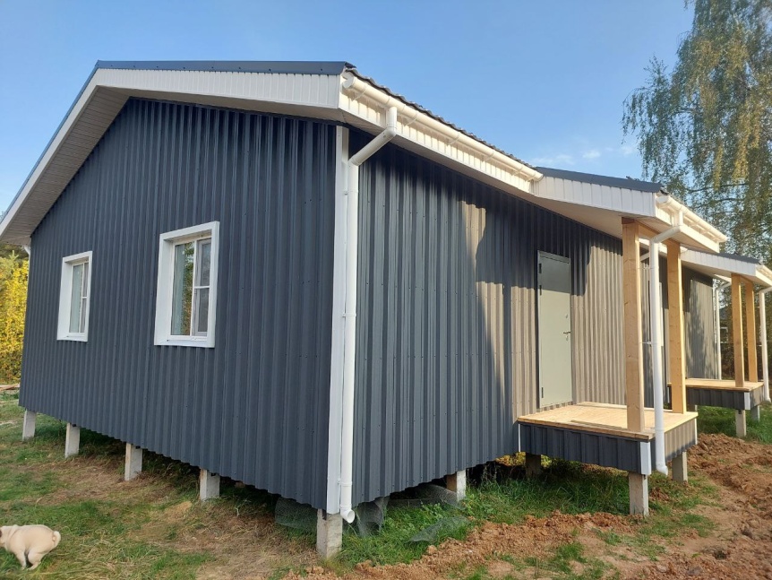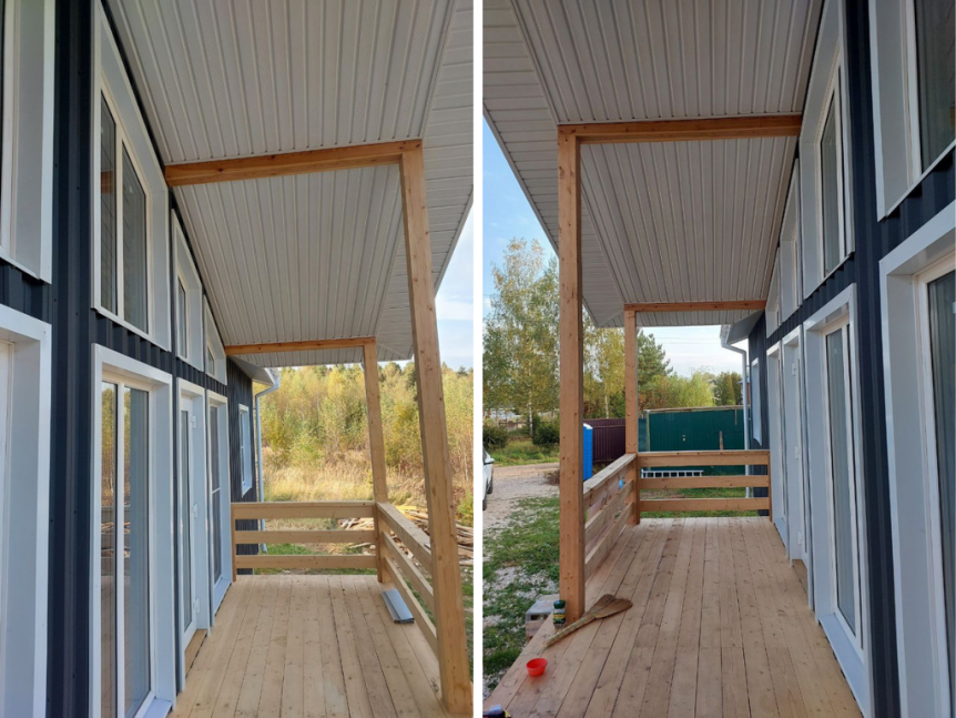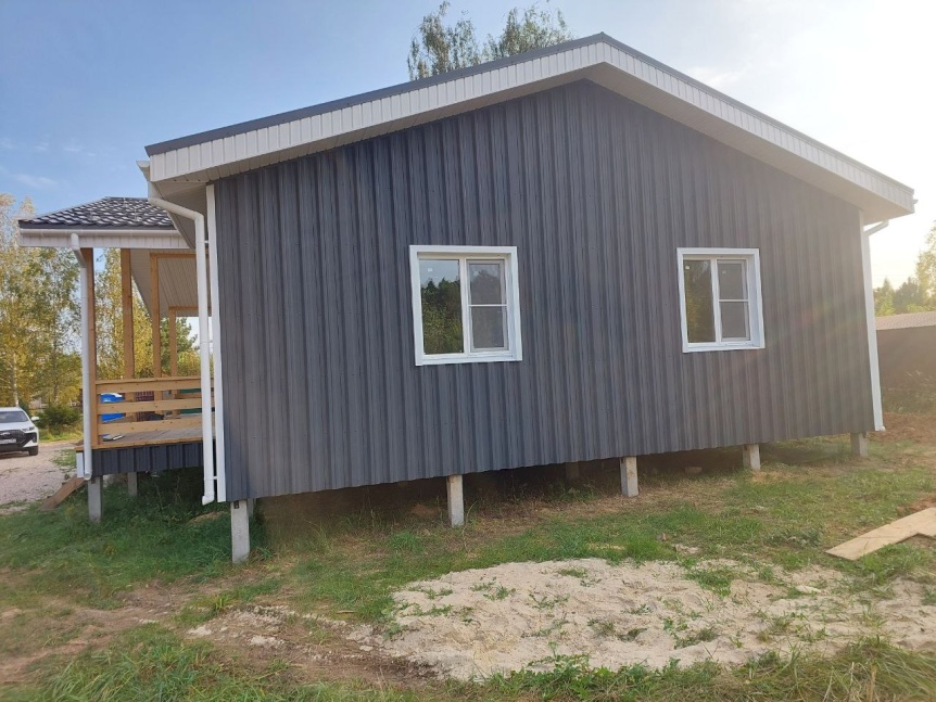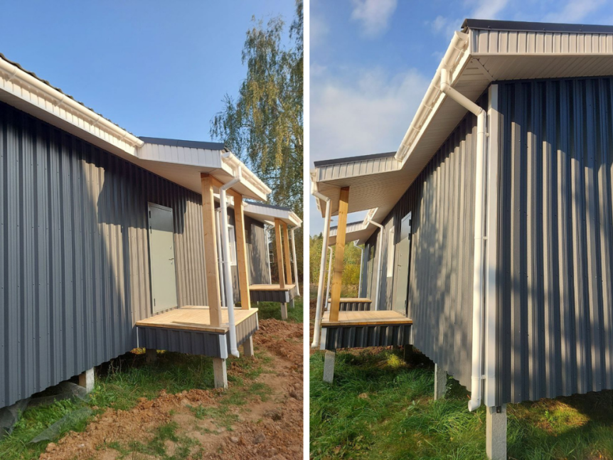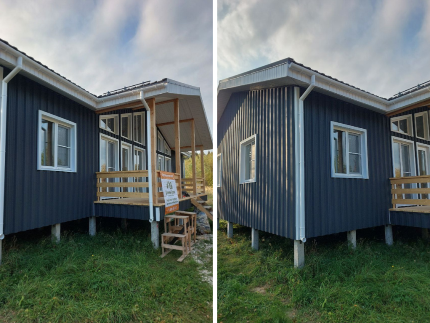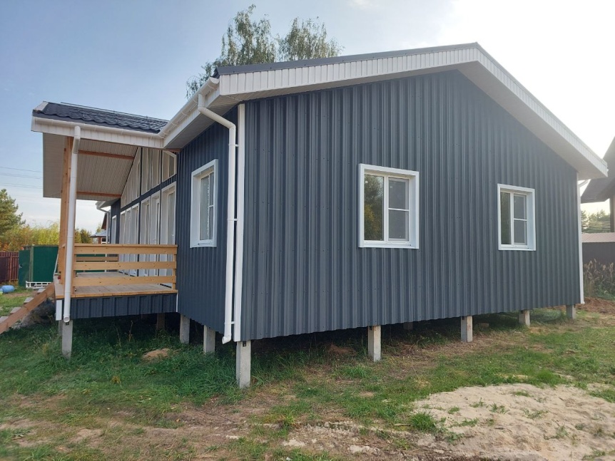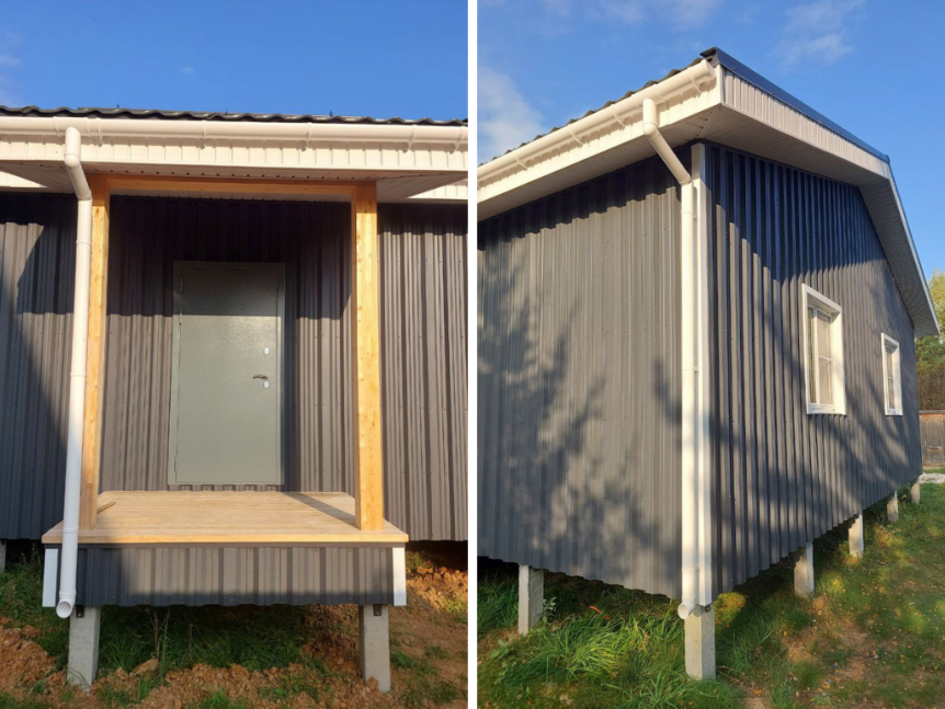 - Для отделки фасада использован профнастил цвета RAL 7024, что придаёт зданию современный и стильный вид.
