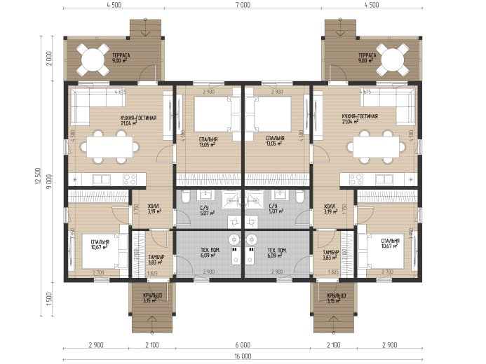 Каждая половина дома имеет отдельный вход, собственную террасу и полный набор необходимых помещений. Внутри предусмотрены уютные спальни, просторные кухни-гостиные, санузлы и хозяйственные зоны. Благодаря рациональной планировке жильцы получают максимум уюта и функциональности даже на компактной площади.