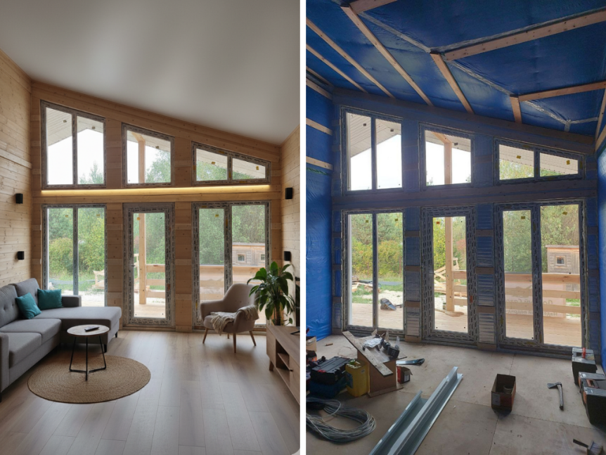 - Внутренняя отделка выполнена из экологичных материалов: деревянные потолки и стены, тёплый пол, износостойкие покрытия.