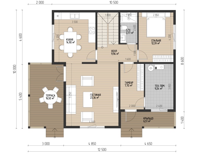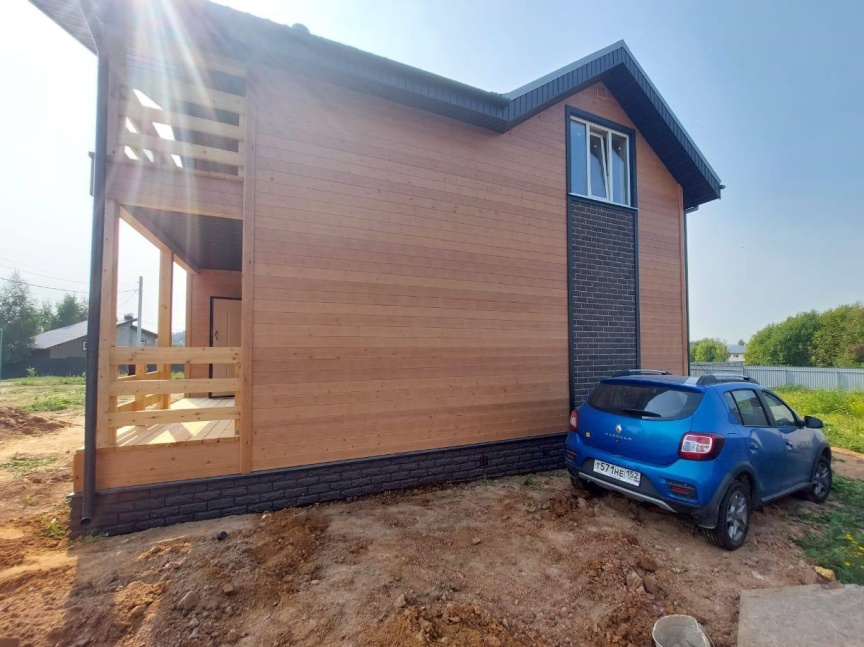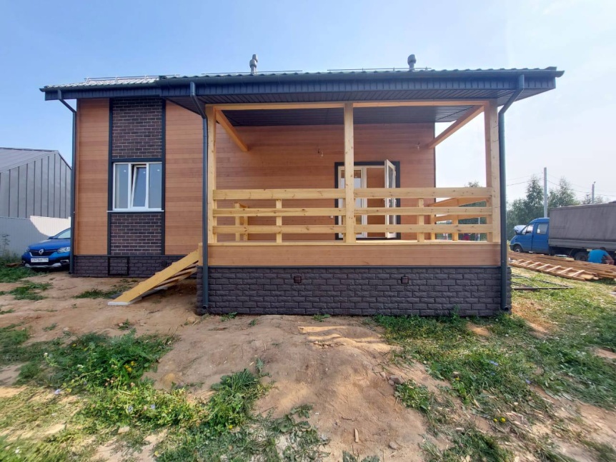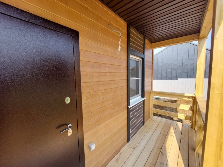 Ведь помимо приятного внешнего вида благодаря двум вариантам облицовки фасада окрашенной в заводских условиях имитацией бруса и панелями, имитирующими кирпич, дом может похвастаться одной из удобнейших планировок. В проекте 4 спальни, 2 санузла, кухня, гостиная, техническое помещение, балкон и просторная терраса.