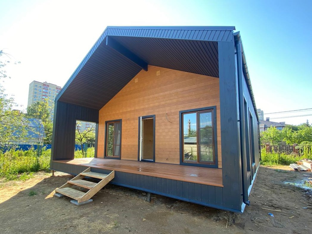 Современные технологии строительства позволяют построить функциональное и невероятно стильное жилье, отвечающее всем требованиям заказчика. Например, каркасный дом, площадью 76 кв.м. на основе проекта Ханна. Небольшая площадь дома включает в себя 2 спальни, санузел, просторную кухню-гостиную, техническое помещение и невероятно уютную террасу.