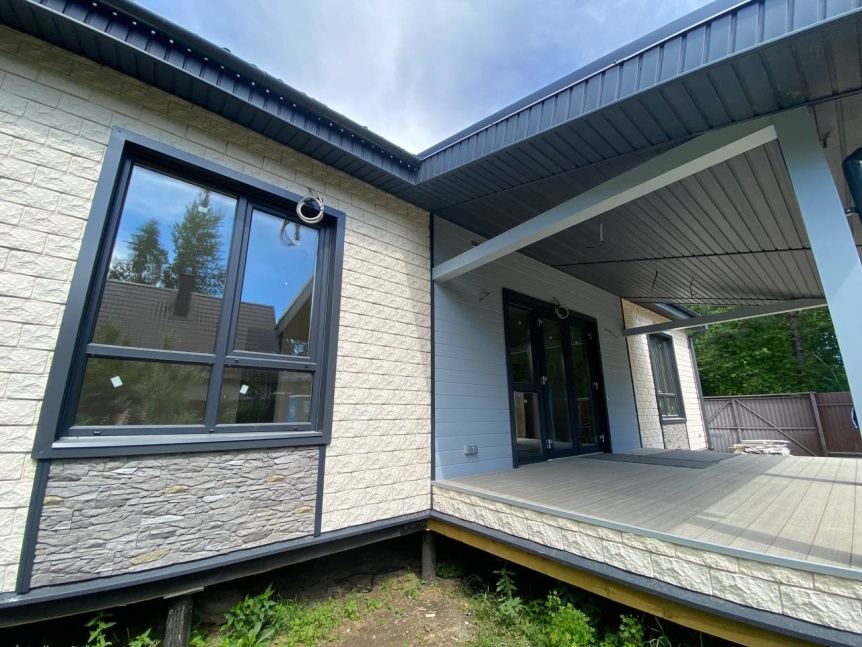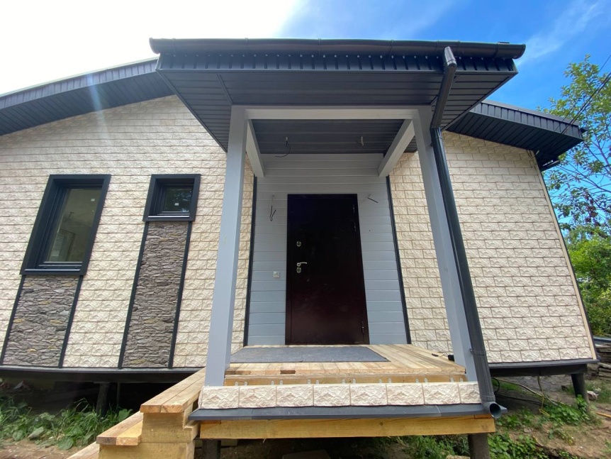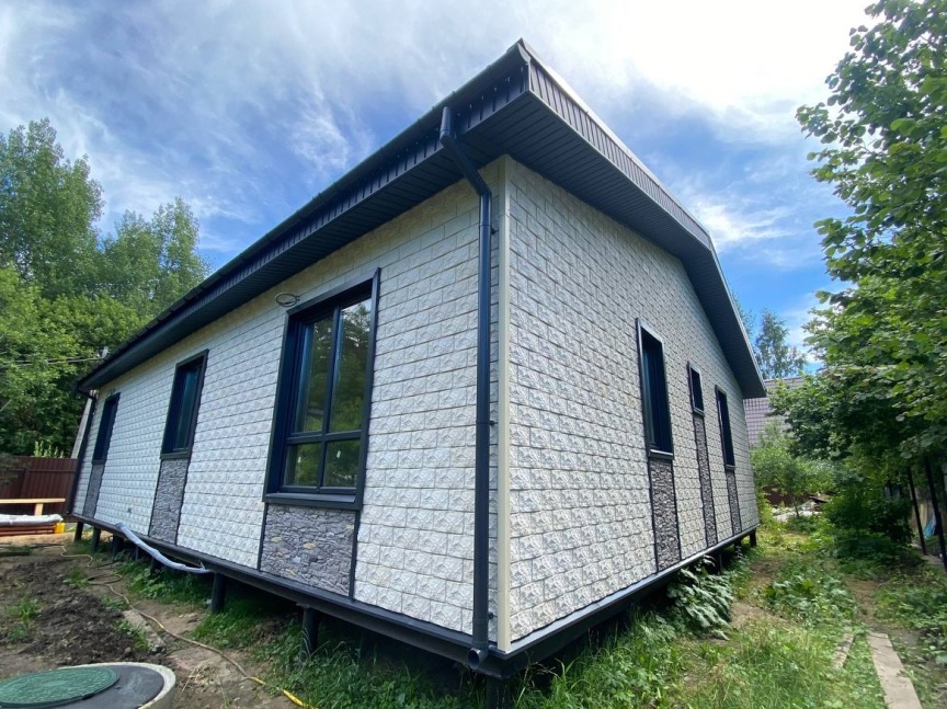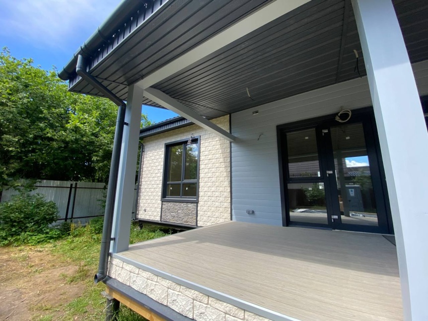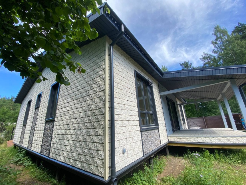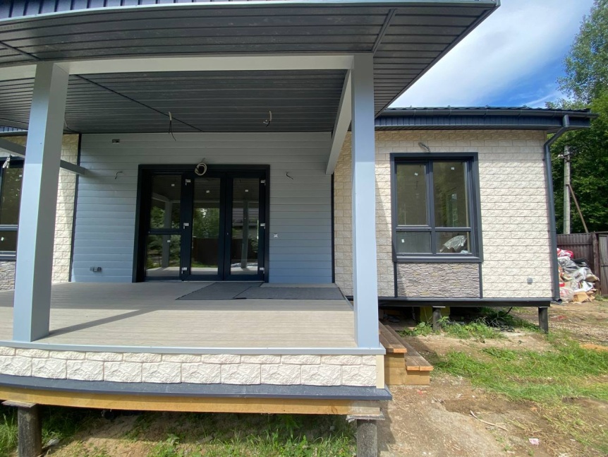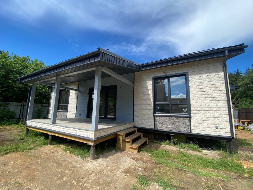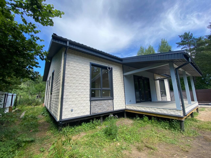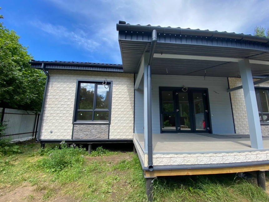Одноэтажный дом по проекту Каннус, площадью 130 кв.м. с тремя спальнями, двумя санузлами, двумя техническими помещениями, террасой и отдельным крыльцом. Финские дома не теряют своей актуальности благодаря их комфортной эксплуатации. Отсутствие лестниц гарантирует безопасность для всех членов семьи, а грамотная планировка обеспечивает простор. Фасад здания облицован панелями "Каньон", имитирующими натуральный камень, а кровля металлочерепицей цвета мокрый асфальт.