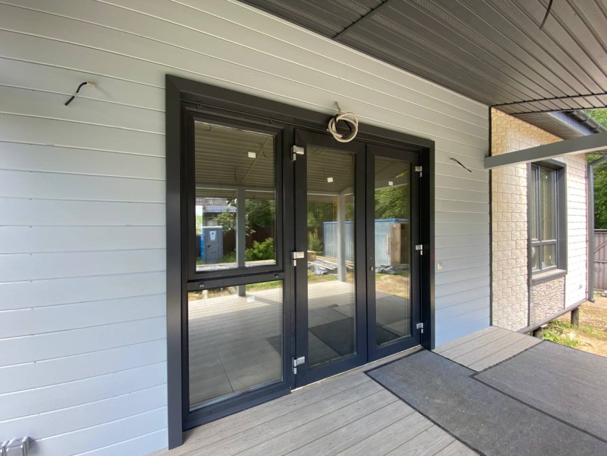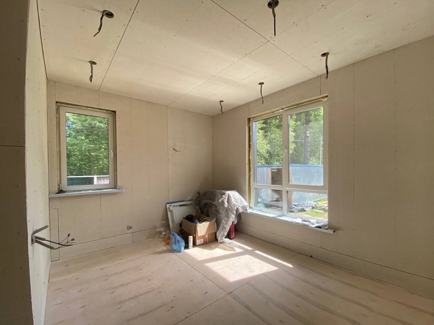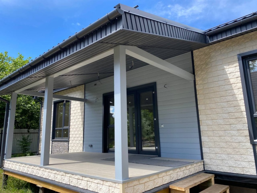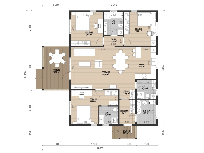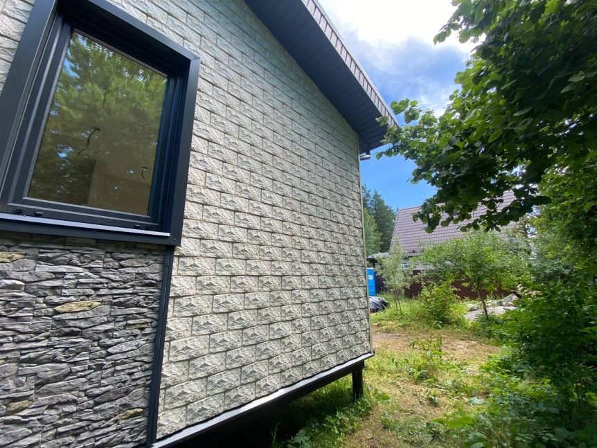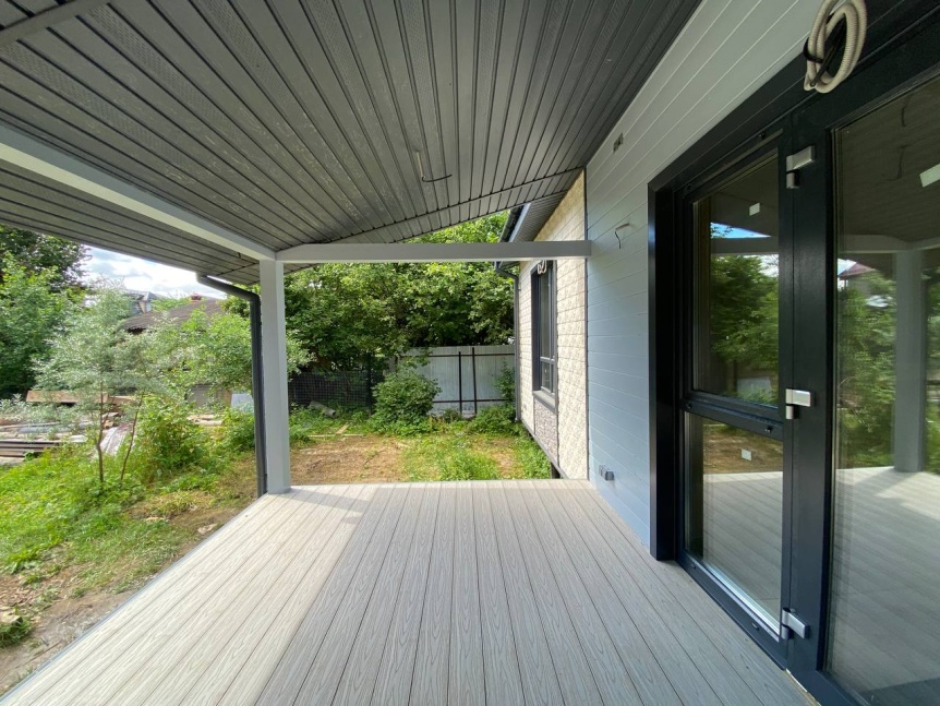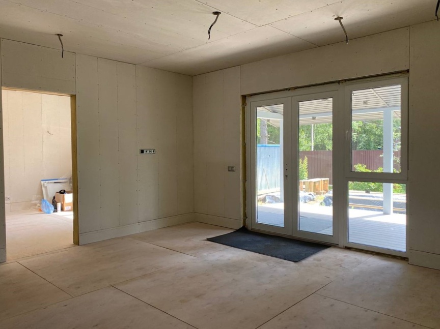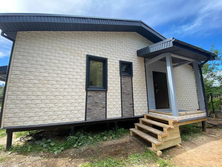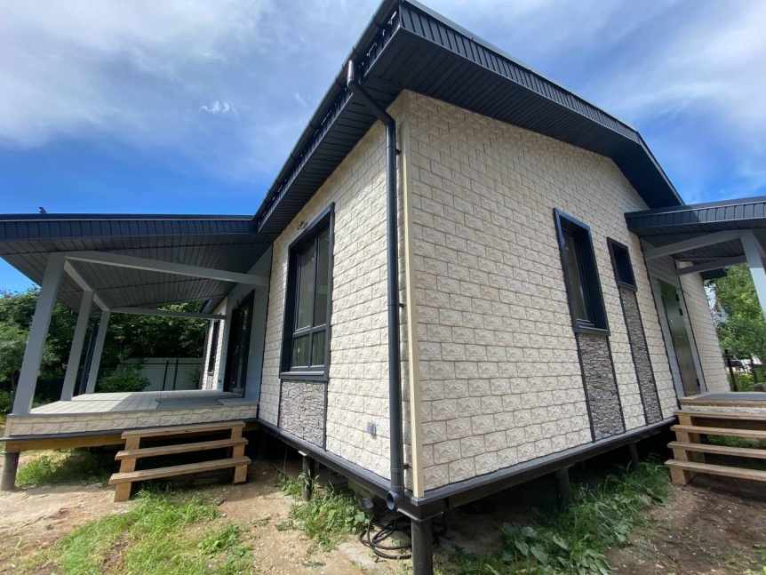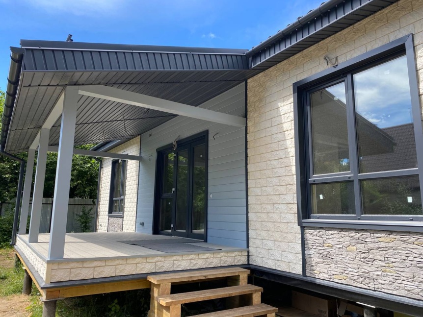 Одноэтажный дом по проекту Каннус, площадью 130 кв.м. с тремя спальнями, двумя санузлами, двумя техническими помещениями, террасой и отдельным крыльцом. Финские дома не теряют своей актуальности благодаря их комфортной эксплуатации. Отсутствие лестниц гарантирует безопасность для всех членов семьи, а грамотная планировка обеспечивает простор. Фасад здания облицован панелями "Каньон", имитирующими натуральный камень, а кровля металлочерепицей цвета мокрый асфальт.