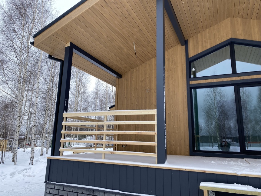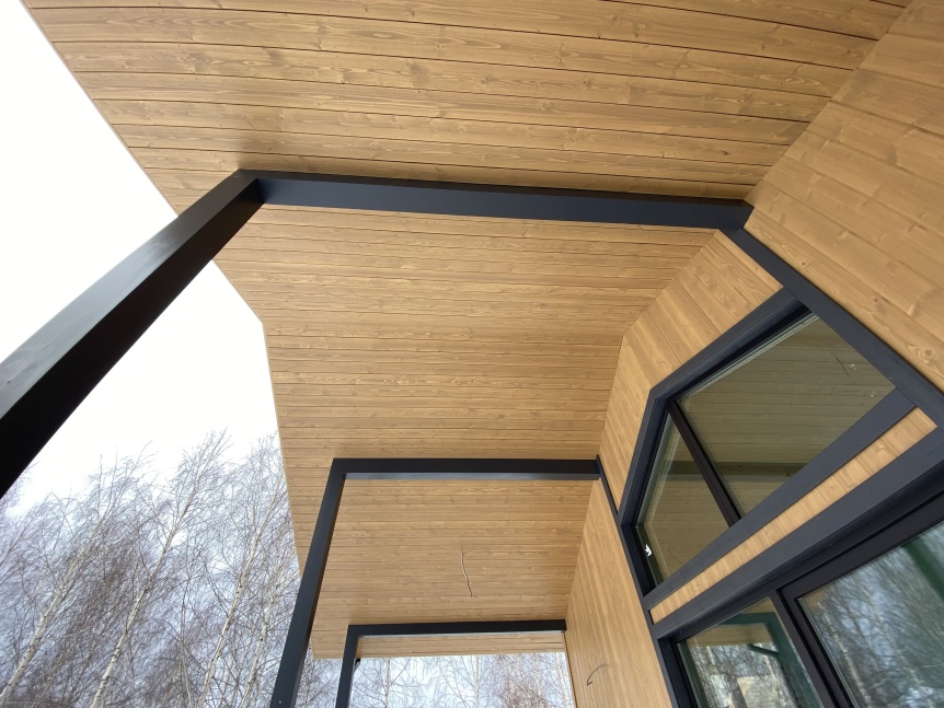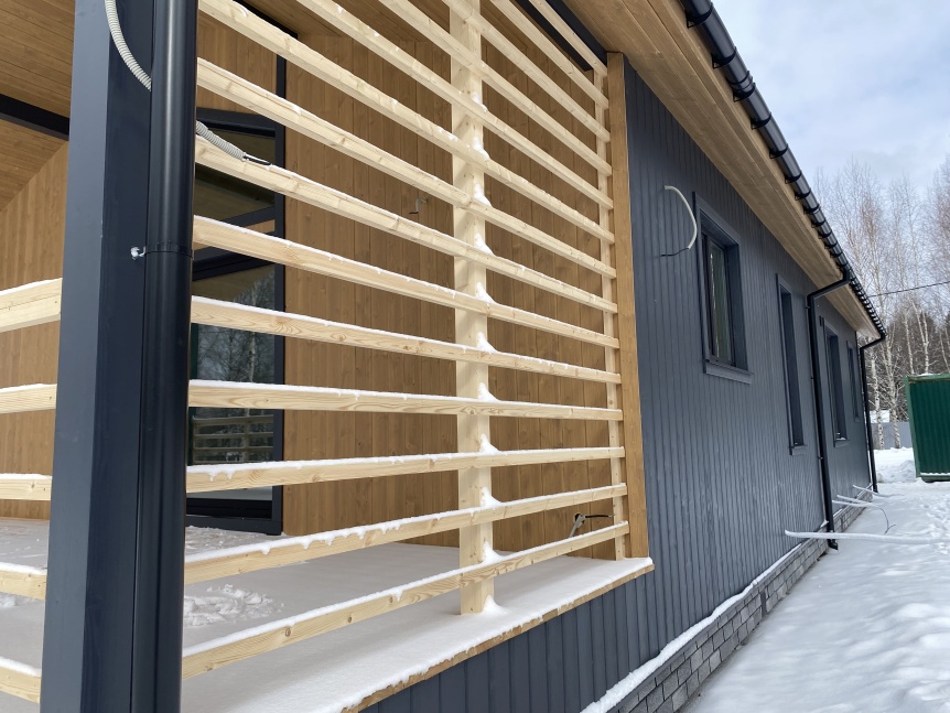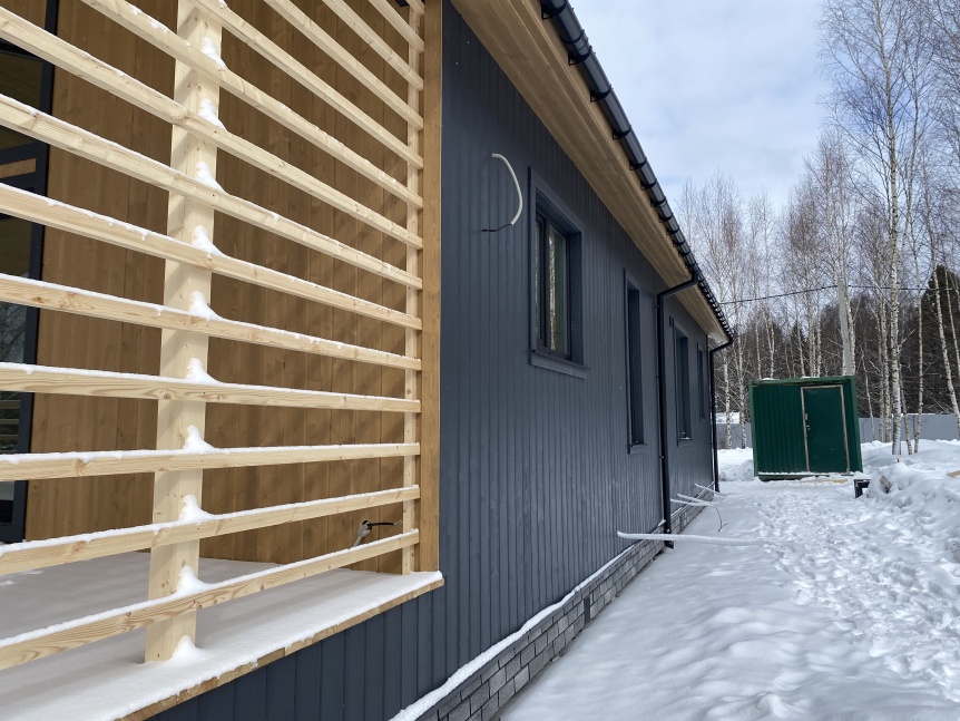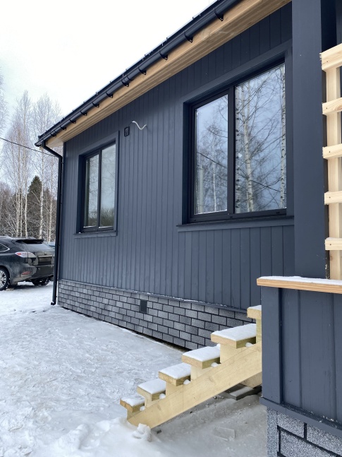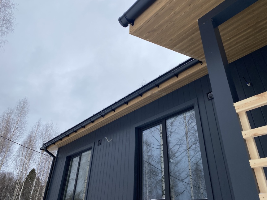 В качестве материала для кровли в данном случае заказчики отдали предпочтение долговечному и стильному кликфальцу в графитовом цвете.
