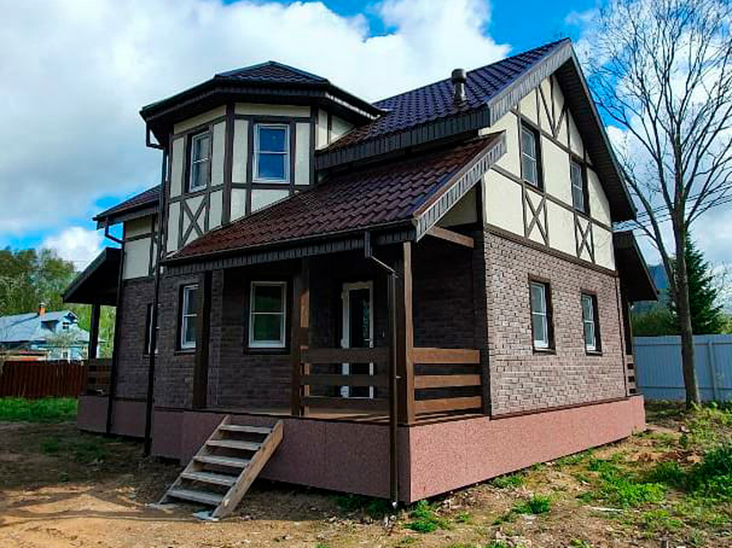 Каркасный дом по проекту «Бристоль» построен в Московской области, Волоколамском районе, деревне Рождествено . Этажность — с мансардой, фундамент — свайно-винтовой. Общая строительная площадь дома составила 130,0 м2, линейные размеры — 10,0×9,0 м. Планировка дома: 4 спальни, 2 санузла, столовая-гостиная, котельная, кабинет, 2 гардеробные комнаты и терраса. Установлены двухкамерные пластиковые стеклопакеты ПВХ Rehau Grazio, ламинированные одностворчатые межкомнатные двери, входная металлическая дверь. Кровля дома — металлочерепица Grand Line Classic с покрытием полиэстер, пластиковая водосточная система.