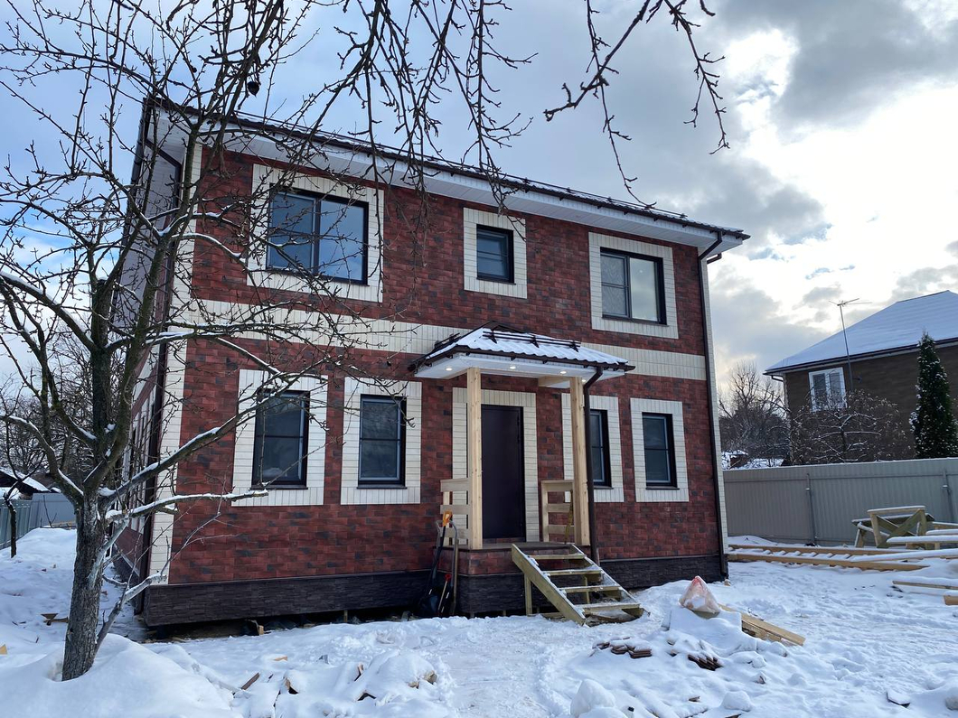 Кровля - металлочерепица шоколадного цвета. А в тон ей ламинация окон, цокольные и оконные отливы.