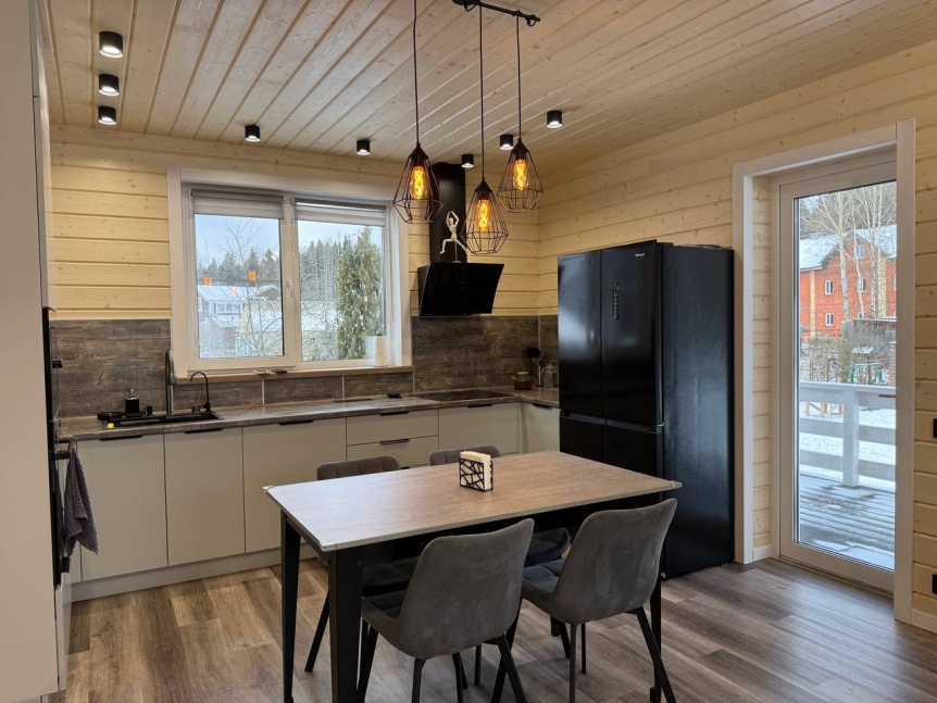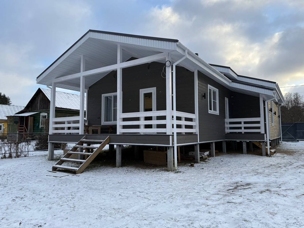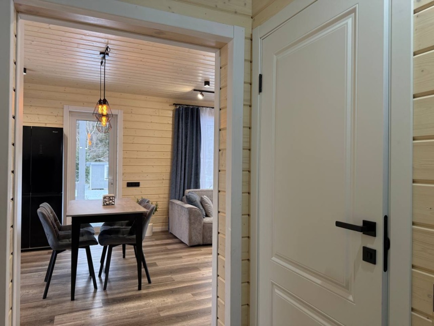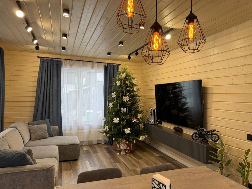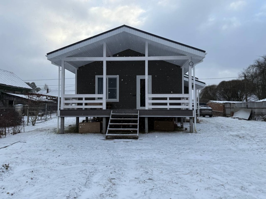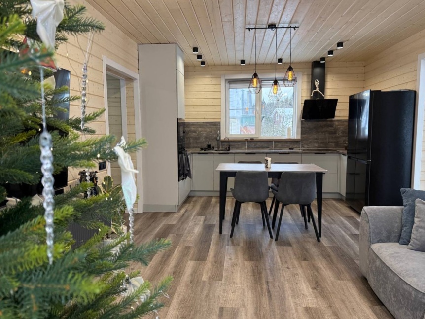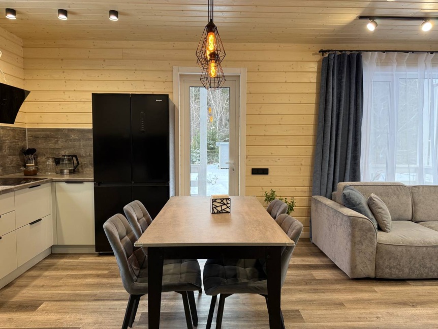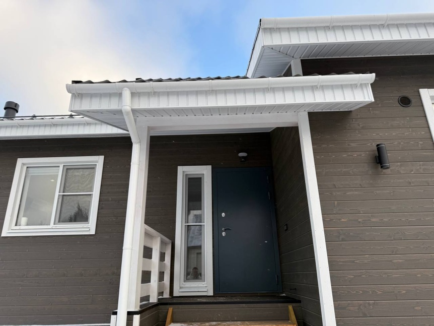 Сердце дома — просторная кухня-гостиная. Здесь легко представить длинные завтраки, шумные ужины и выход на террасу в тёплое время года. Терраса логично продолжает жилое пространство и становится полноценным местом отдыха, а отдельное крыльцо аккуратно отделяет входную зону от частной жизни дома.