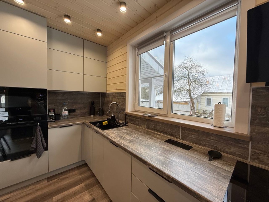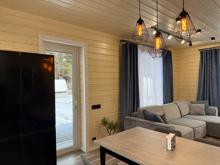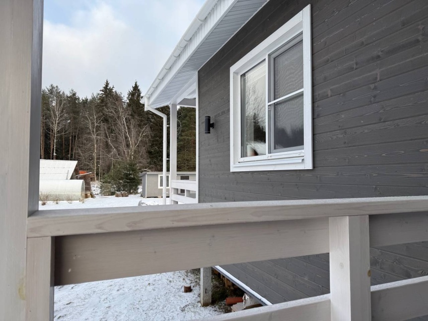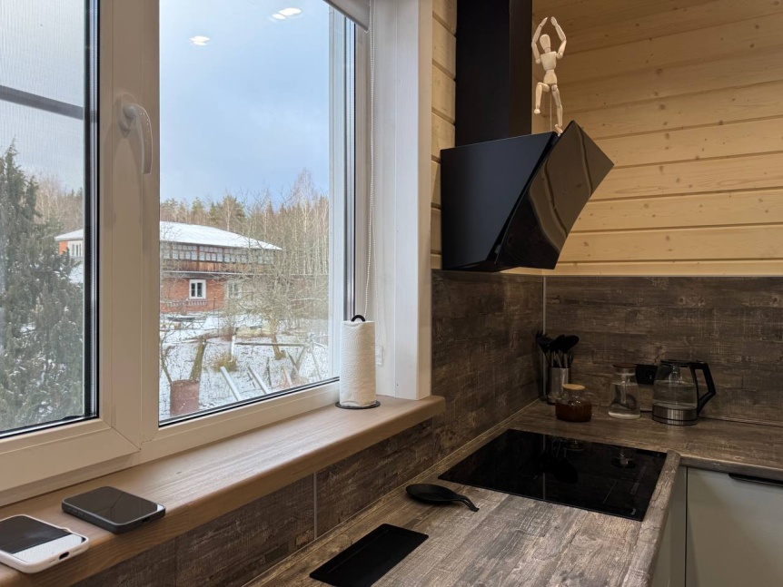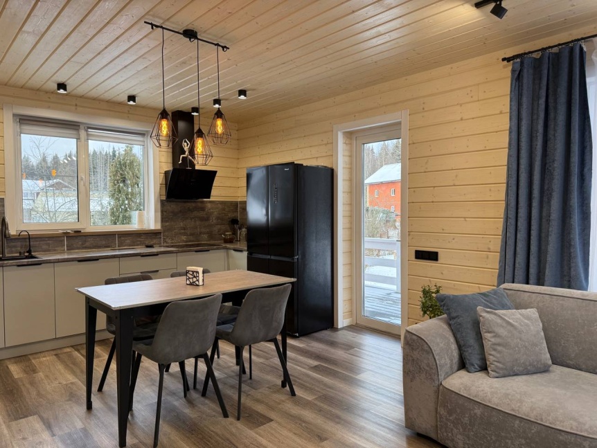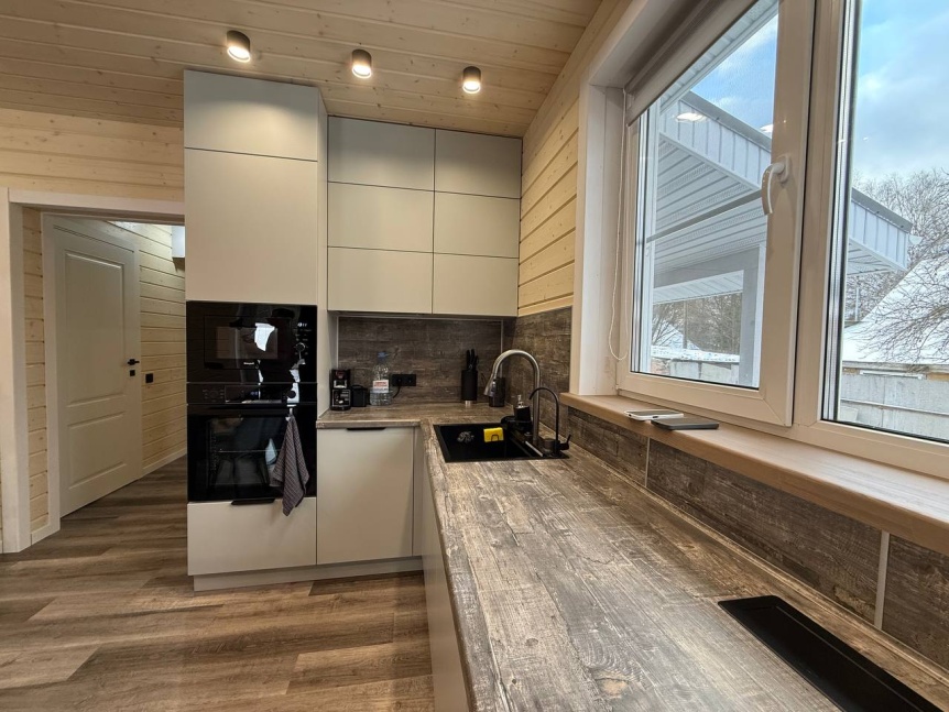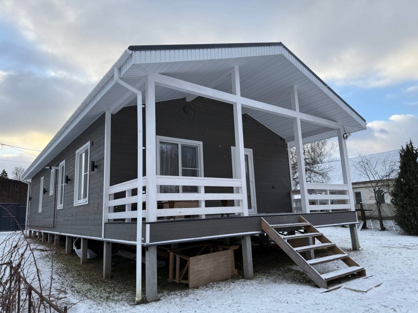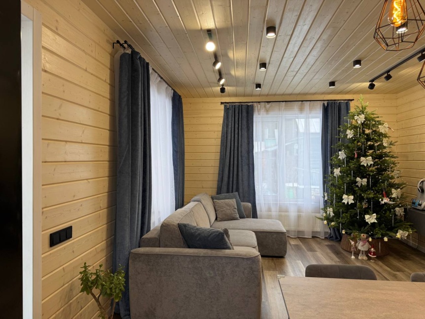 Сердце дома — просторная кухня-гостиная. Здесь легко представить длинные завтраки, шумные ужины и выход на террасу в тёплое время года. Терраса логично продолжает жилое пространство и становится полноценным местом отдыха, а отдельное крыльцо аккуратно отделяет входную зону от частной жизни дома.