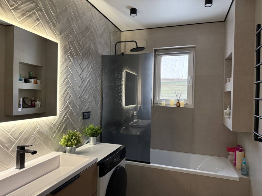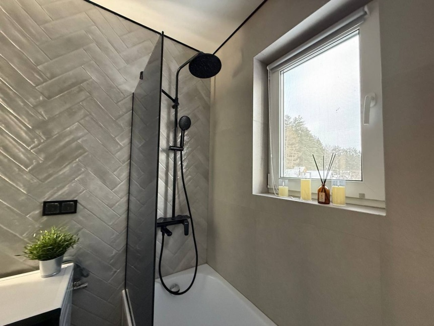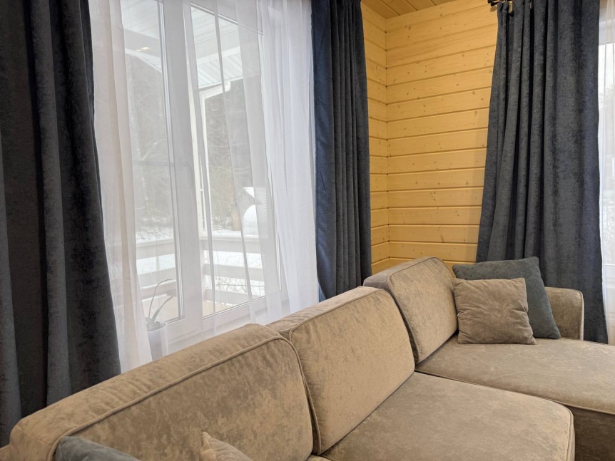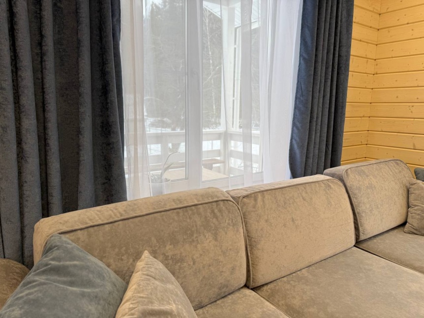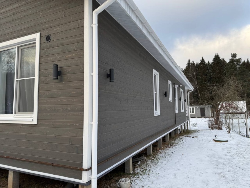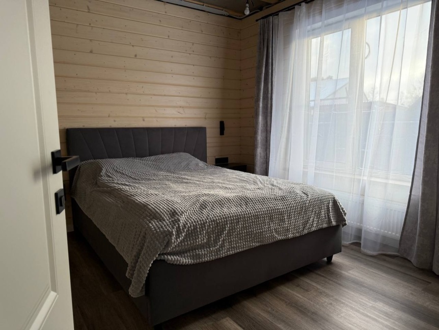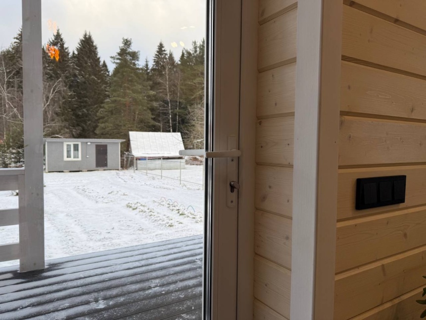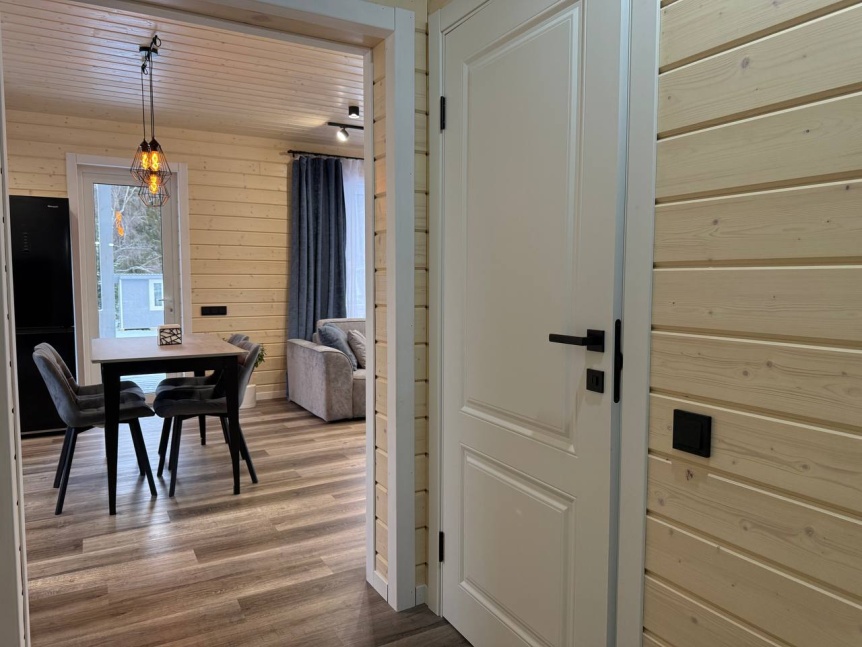 Сердце дома — просторная кухня-гостиная. Здесь легко представить длинные завтраки, шумные ужины и выход на террасу в тёплое время года. Терраса логично продолжает жилое пространство и становится полноценным местом отдыха, а отдельное крыльцо аккуратно отделяет входную зону от частной жизни дома.