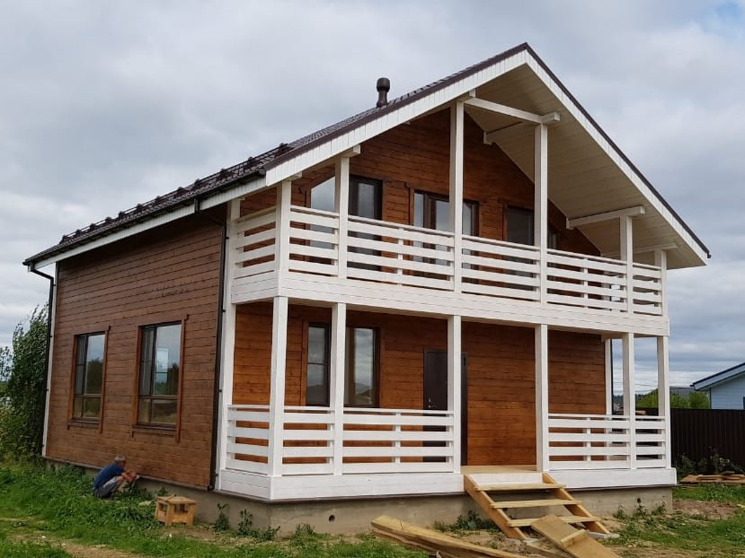 Каркасный дом построен в дп Луговой. За основу был взят проект Кано-3. Площадь дома 153 кв.м, линейные размеры 9.85x8.85м. Этажность - мансардный, комплектация под ключ, фундамент ленточный (бетон марки М300). К дому пристроена терраса. Кровля - металлочерепица, пластиковые софиты и водосточная система. Проведены все необходимые инженерные коммуникации, установлены снегозадержатели. Планировка 1 этажа: гостиная, кухня, спальня, санузел, котельная, терраса. Планировка 2 этажа: 3 спальни, санузел, гардероб, балкон.