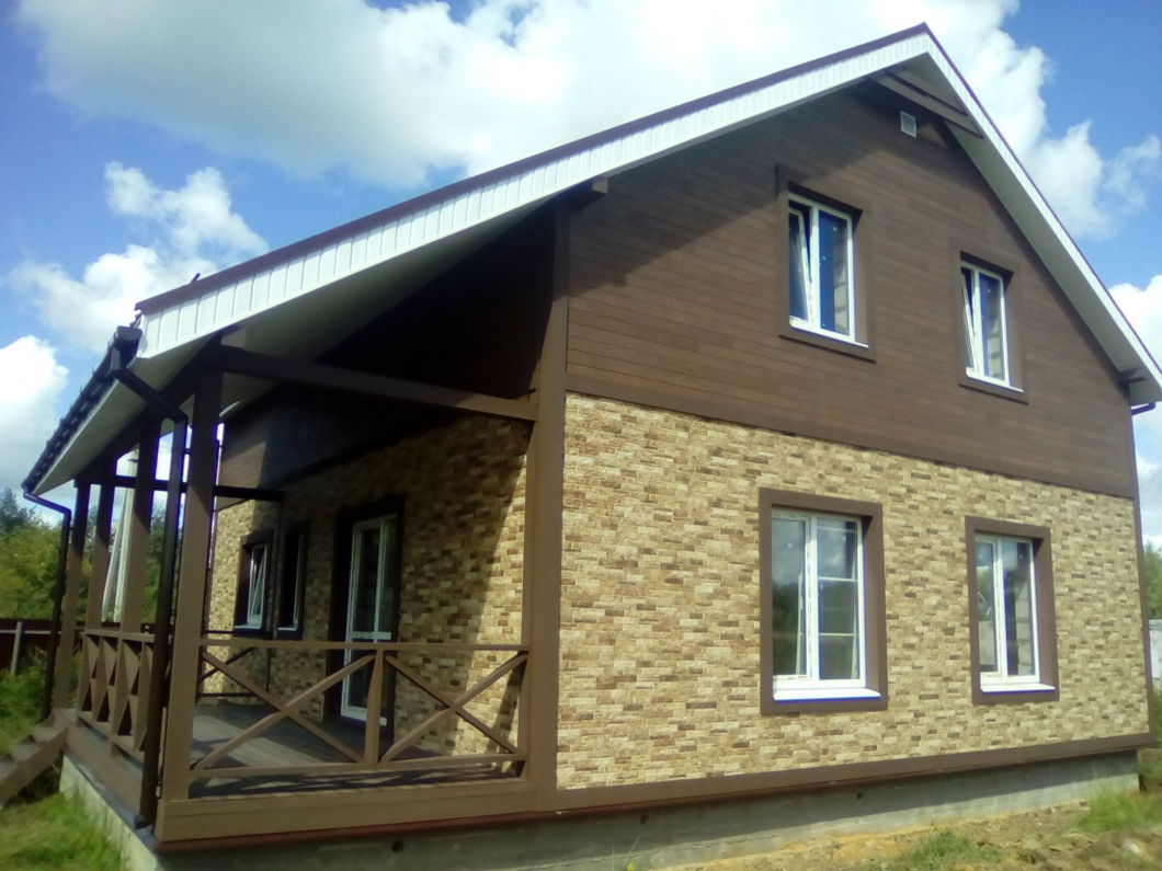 Каркасный дом, построенный в компании "Дачный Сезон". Для придания законченного внешнего вида впервые были использованы фиброцементные панели коричневого цвета. Каркасная конструкция состоит из различных деревянных элементов, где все составляющие находятся на определенном расстоянии относительно друг друга, а образовавшиеся пространство между ними заполняется качественным утеплителем. В данном доме утепляющим материалом является минплита, на основе базальтового волокна.