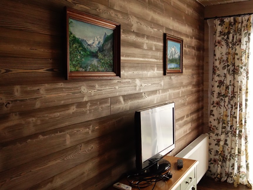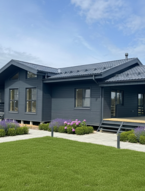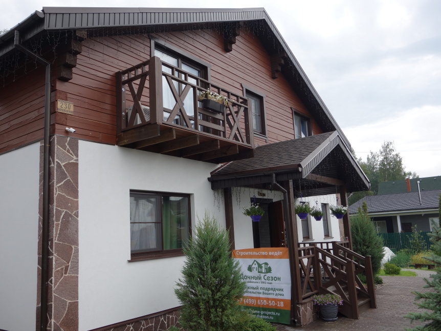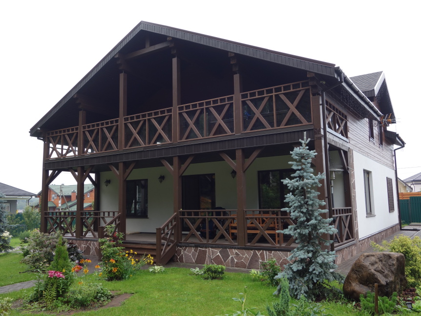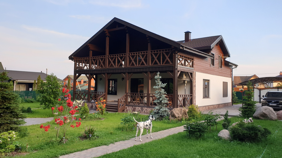 Дом, построенный вблизи д. Карякино, выполнен из керамических кирпичных блоков и массивного профилированного бруса. Этажность - мансардный, фундамент - свайно-ростверковый. Общая строительная площадь дома 345.42 кв.м, полезная площадь 217.94 кв.м. Линейные размеры: 10.6х11.6 м. Планировка дома: 4 спальни, 2 санузла, кухня-гостиная, комната отдыха, отдельная котельная, есть 2 балкона и терраса. Установлены двухкамерные ламинированные стеклопакеты. Кровля дома – гибкая черепица Shinglas, перфорированные софиты и водосточная система Docke (цвет - шоколад).