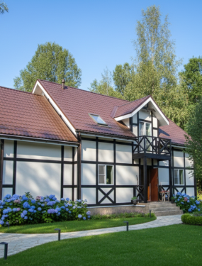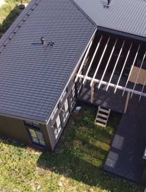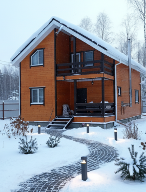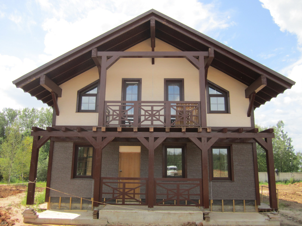 Двухэтажный дом с мансардным этажом построен по технологии «каркас» в поселке «Софрино» (Московская область). Установлен на свайно-винтовый фундамент. Общая площадь дома - 207 м². В доме 4 комнаты, просторная гостиная с кухней, 2 санузла, есть балкон. Для наружной отделки использовались эксклюзивные фасадные панели «Nichiha». Этот облицовочный материал абсолютно негорючий, к тому же и морозостойкий, что весьма важно в российских климатических условиях.  Для материала кровли была использована металлочерепица, покрытая дополнительным защитным слоем.
