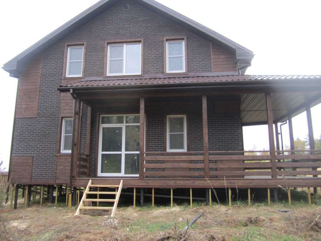 Дом 212 м² построен в коттеджном поселке «Тимашово» в Калужской области. В доме 5 спален, большая гостиная, кухня-столовая, 3 санузла. Для возведения дома использовалась современная каркасная технология. Фасад дома обшит клинкерными термопанелями, которые служат не только украшением, но и несут в себе функцию дополнительной теплоизоляции. Прекрасно вписался эркер, который создает уют и наполняет гостиную и спальню на втором этаже естественным освещением. Дом опоясывает крытая просторная терраса, на которой при желании можно установить мангальную зону.