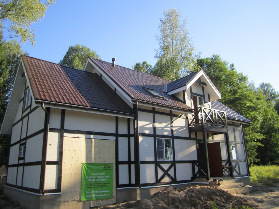 На сегодняшний день каркасная технология возведения домов является самой востребованной. Такие дома строятся быстро, экономят множество ресурсов и являются самыми доступными домами. Так и коттедж в д. Вязьмы был построен по каркасной технологии. Линейные размеры дома - 14х8,8 м, площадь - 246 м². На первом этаже – гостиная-столовая, украшенная круглым эркером, кухня, спальня, санузел и техническое помещение. На втором этаже 4 спальни и еще один санузел. К дому пристроен гараж с автоматическими воротами. Попасть в него можно также из дома через техническое помещение. Фасад в стиле «Фахверк» облицован ЦСП с мраморной крошкой.