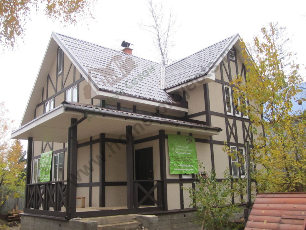Комфортабельный и простой дом в популярной облицовке фасада в стиле «Фахверк» построен в г. Москва (Пятницкое шоссе). Технология строительства – «каркас». В доме 4 спальных комнаты, гостиная с кухней, 1 санузел – удобная и лаконичная планировка. Общая площадь – 155 м². Небольшая закрытая терраса объединяет жилое пространство дома и природное окружение. Крыша покрыта металлочерепицей, установлены двери и окна ПВХ. Хороший вариант, как для сезонного, так и постоянного проживания. Подойдет для строительства на узком участке.