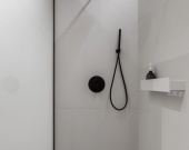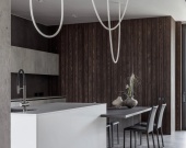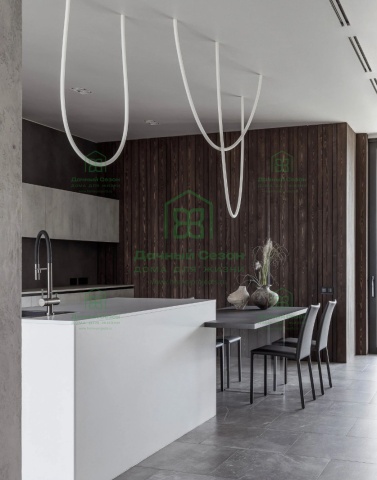 Лаконичный фасад с характерными фахверковыми элементами и большими панорамными окнами придаёт дому лёгкость и ощущение единения с природой. Пространство внутри организовано максимально удобно: просторная гостиная с высоким потолком объединена с кухней и столовой, создавая единое светлое пространство для жизни и общения.