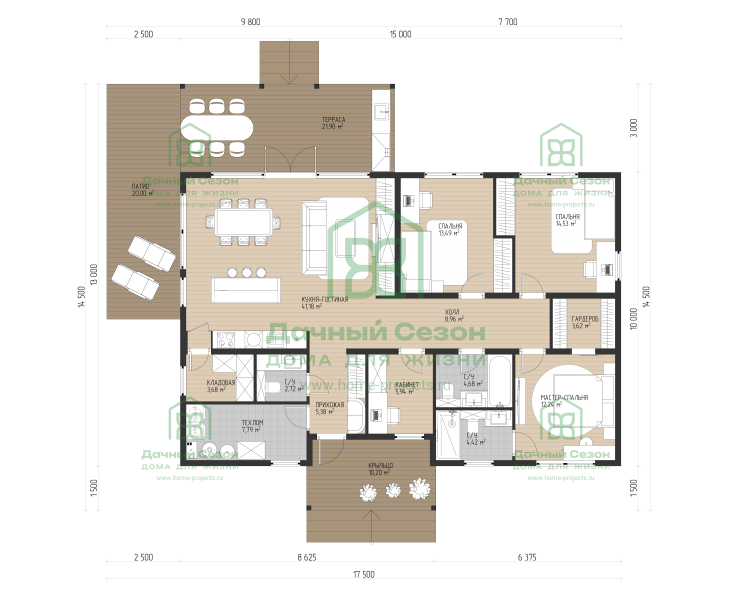 Общая площадь — 146 м², габариты по фундаменту ≈ 10 × 15 м (точно 17,5 м по длинной стороне с учётом выступов террасы и крыльца).
