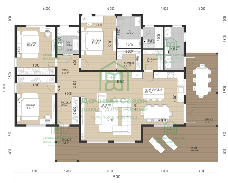 В спальной зоне — три просторные спальни (по 16 м² каждая), два санузла и отдельная гардеробная. Для удобства жильцов предусмотрены сауна, техническое помещение, а также кладовая и прихожая с гардеробом у входа.