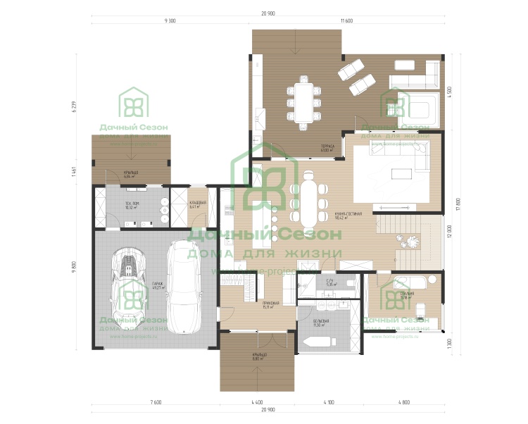 - Гараж на 2 автомобиля (~49 кв.м) с удобным прямым входом в дом