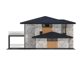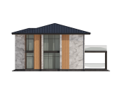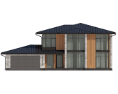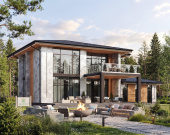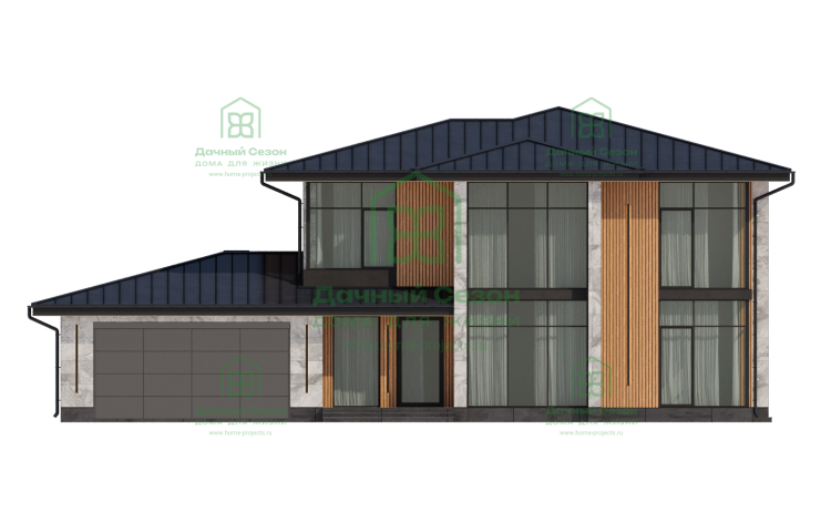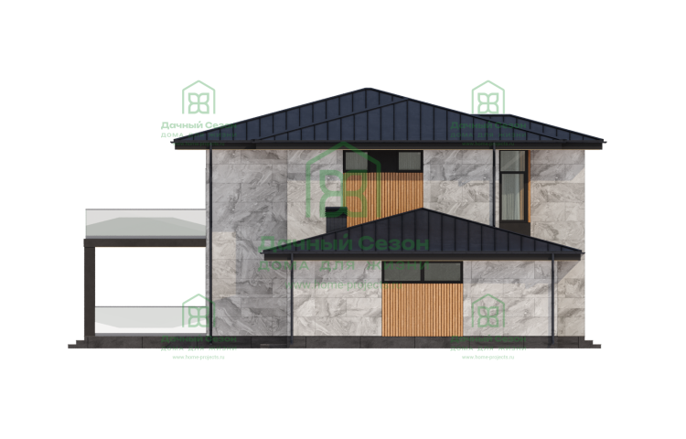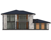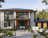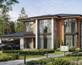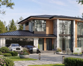 - Представительный фасад в стиле современного минимализма и натуральными материалами: дерево, камень, большие панорамные окна от пола до потолка, кровля с выразительными свесами