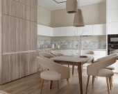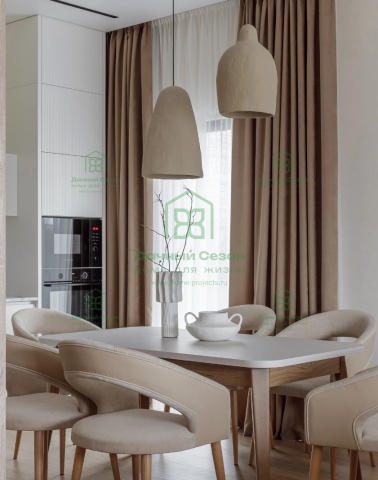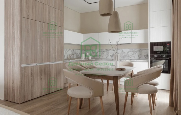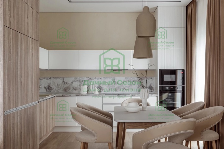 - Просторная кухня-гостиная 90+ кв.м с островом, огромной обеденной зоной и выходом на широкую террасу 61 кв.м — идеальное пространство для семейных встреч и приёма гостей