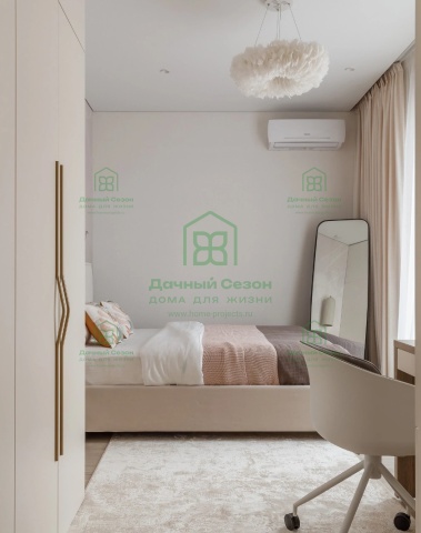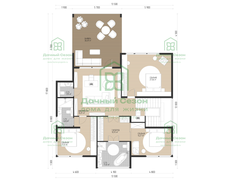 - Четыре спальни (главная мастер-спальня 27 кв.м + три гостевые 15–17 кв.м)