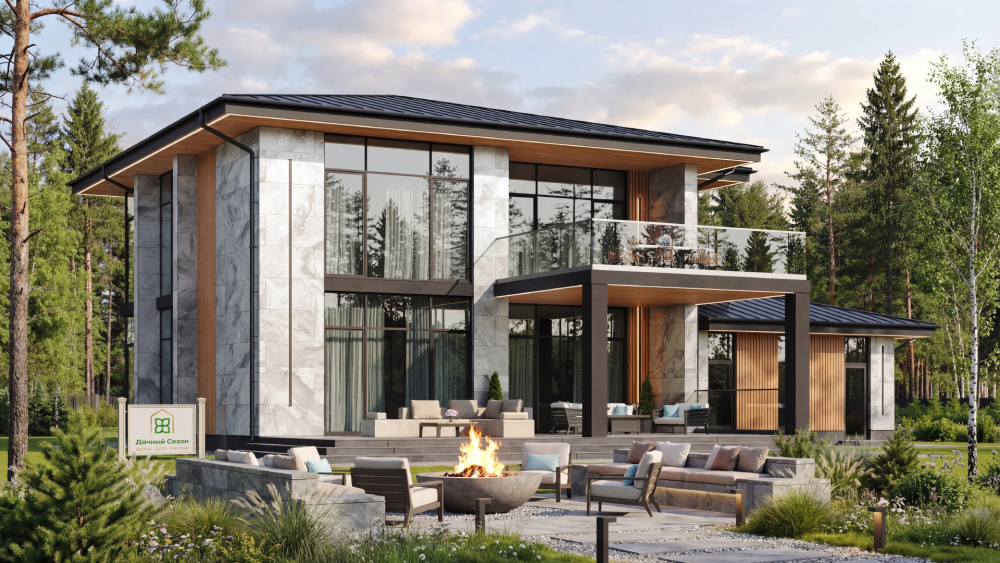 Проект дома «Куршевель» от компании «Дачный Сезон» — это современный двухэтажный загородный коттедж премиум-класса для круглогодичного проживания, сочетающий элегантную архитектуру, продуманную планировку и статусный внешний вид.
