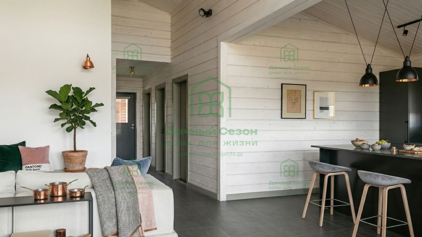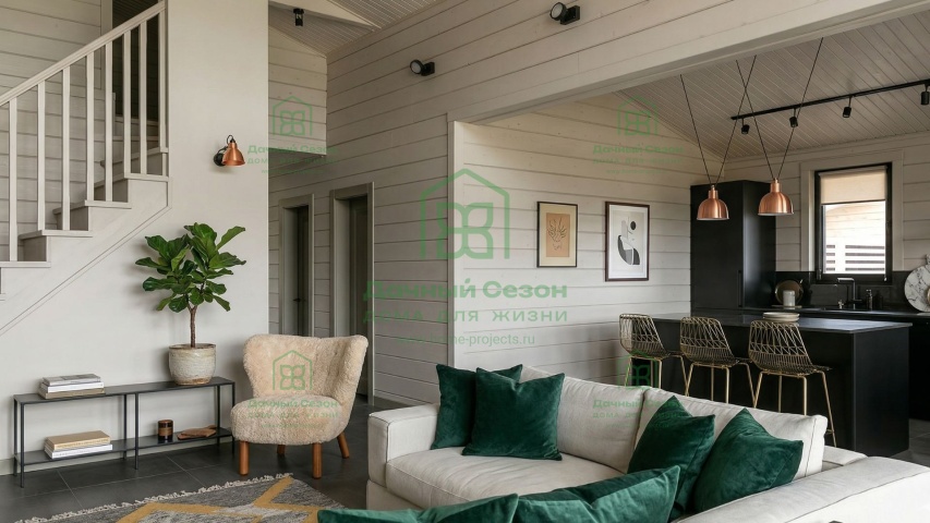 Кухня-гостиная (33,27 кв. м) — сердце дома. Благодаря отсутствию перекрытия над частью гостиной (второй свет), помещение выглядит величественно. Зона кухни выделена в отдельную нишу с окном и удобным «островом».