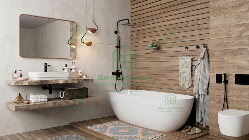 Ванная комната (7,84 кв. м) — по-настоящему просторное помещение, где легко размещается полноразмерная ванна, стиральная машина и системы хранения.