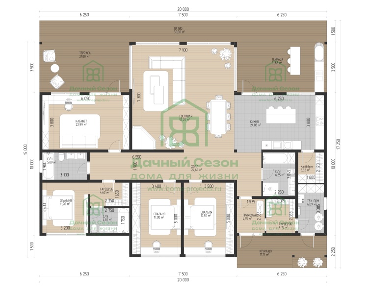 Оквил — просторный одноэтажный дом 240 м² (габариты 20 × 15 м), созданный для комфортной жизни без лестниц и компромиссов. Идеален для семей с детьми или пожилыми родственниками.