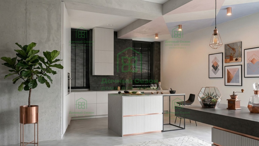 Кухня-гостиная (32 кв. м) — сердце дома. Благодаря панорамным окнам и выходу на террасу, пространство залито светом. Здесь легко разместится большая зона отдыха с угловым диваном и обеденная группа.